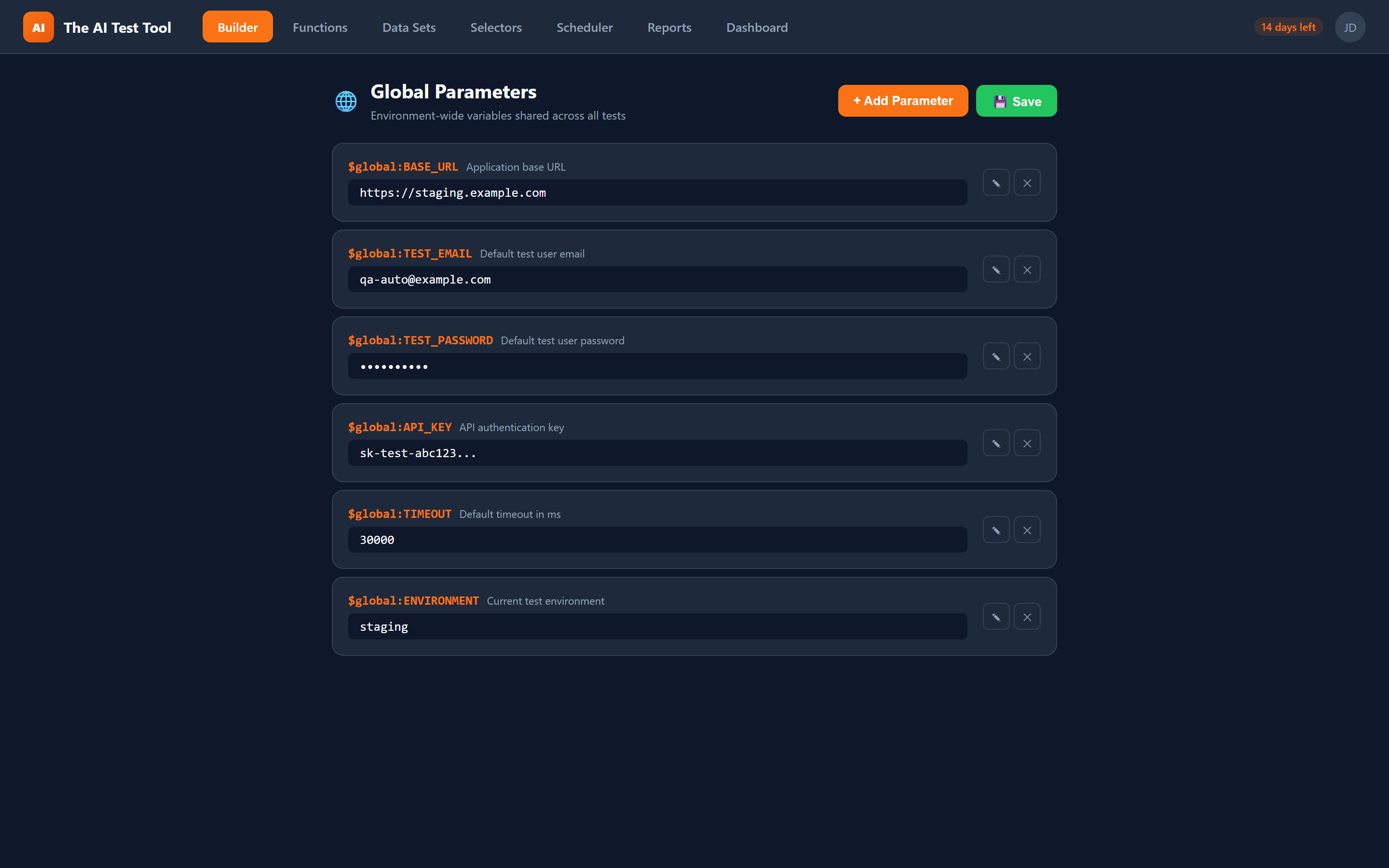 Define environment-wide variables like base URLs, credentials, and feature flags. Reference them in any test with a single prefix.