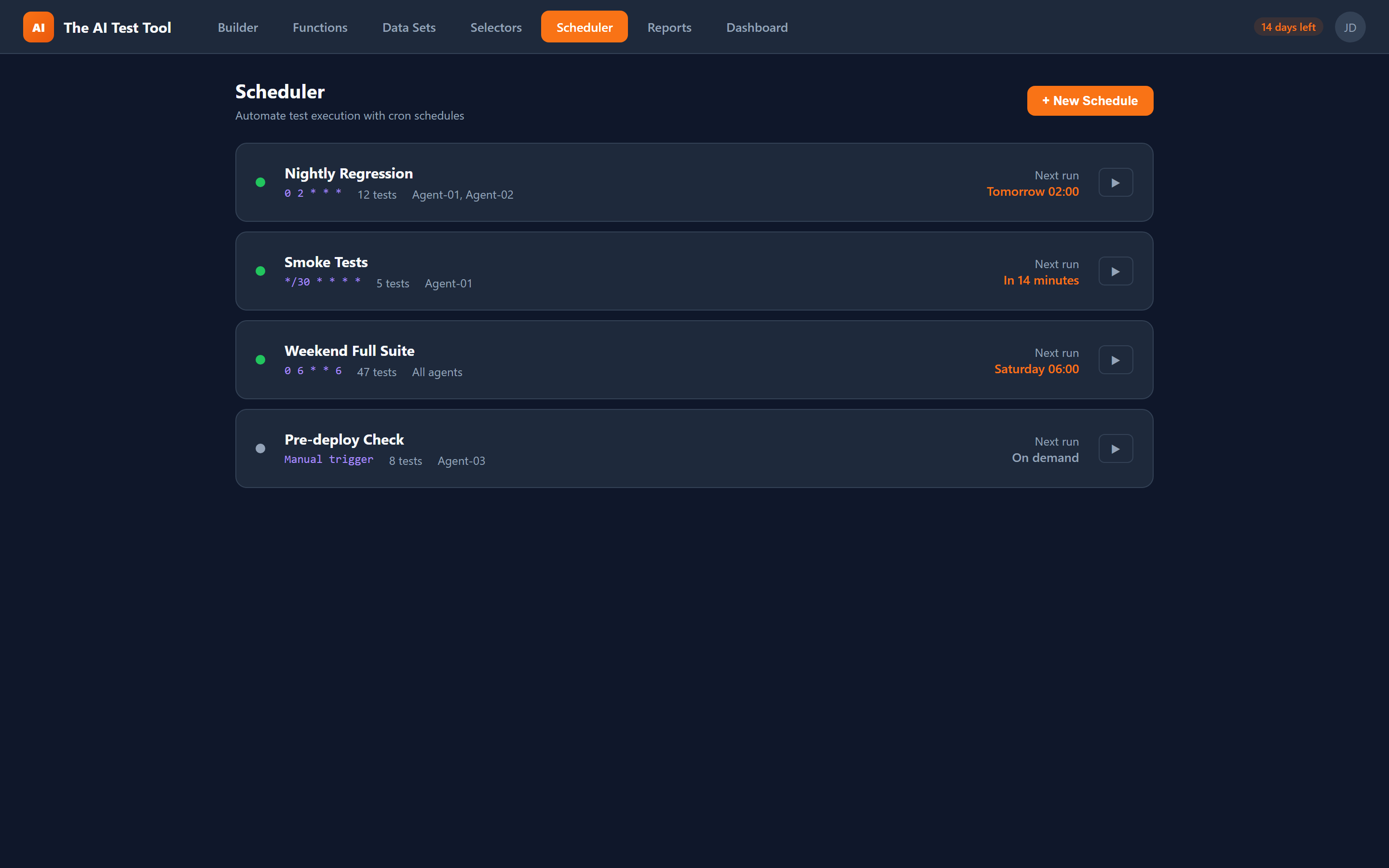 Schedule tests to run automatically and distribute execution across multiple agents. Monitor everything from a single dashboard.