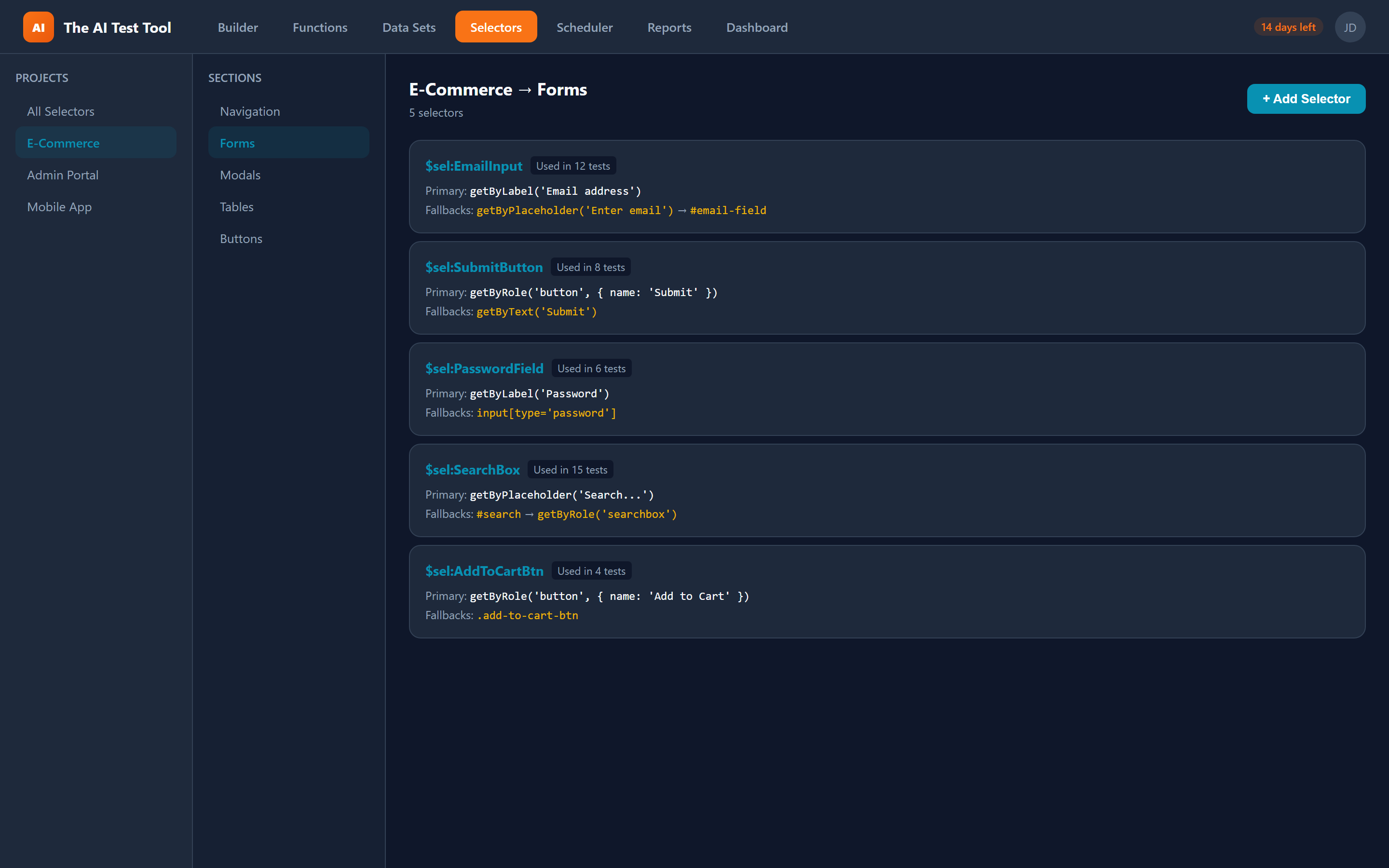 Centralize your selectors with automatic fallbacks. When a primary selector breaks, fallbacks keep your tests running.